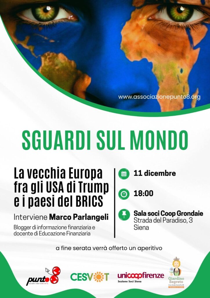 Si informano i nostri Soci che giovedì 11 dicembre 2025 – alle ore 18:00 – presso la “Sala Soci Coop Grondaie” – Strada del Paradiso, 1/3/5 – Siena, si terrà l’evento “Sguardi sul mondo” organizzato dall’Associazione Punto 8.